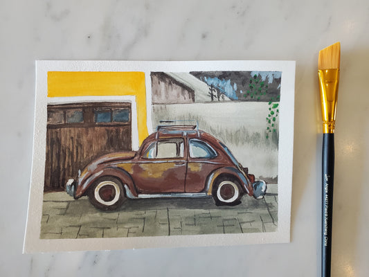 Brown Volkswagen Beetle - Original 5x7in. Gouache Painting